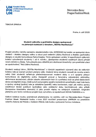 TEXTile Manifestoes, ein engagiertes Projekt von Studierenden der UMPRUM, präsentiert die gemeinsame Arbeit von Studierenden des Ateliers für Bekleidungs- und Schuhdesign mit dem Atelier für Grafikdesign und visuelle Kommunikation, dem Atelier für Schriftgestaltung und Typografie und dem Atelier für Fotografie II.